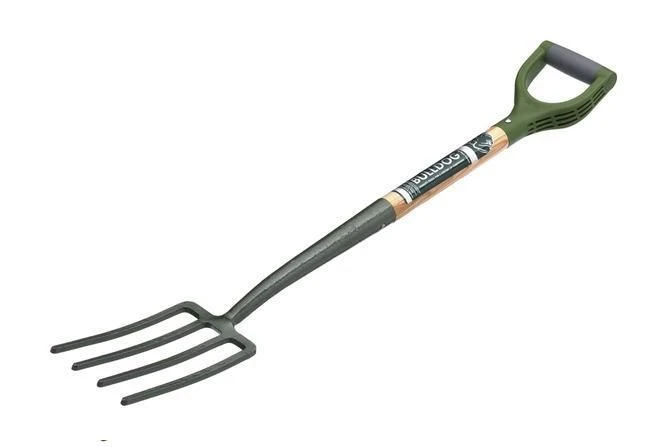 A traditional border fork but fitted with a modern forward tilt ergo grip handle to help reduce stress when digging.